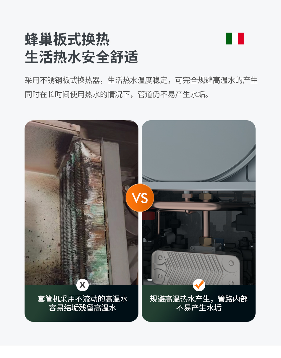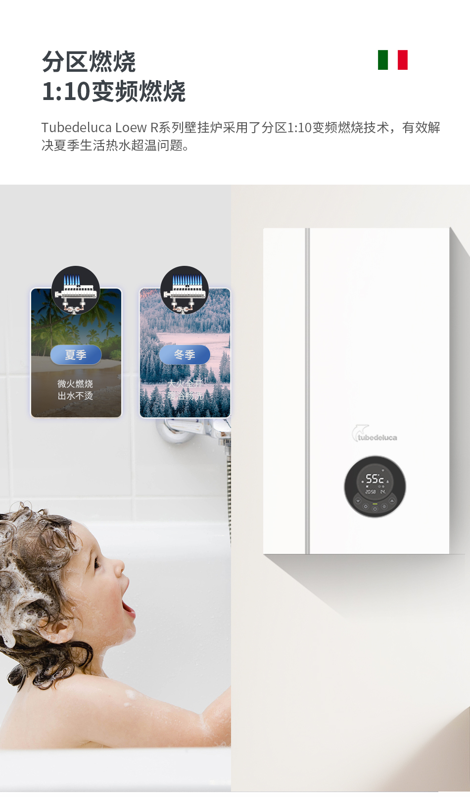 Tubedeluca Hajdu系列壁挂炉采用了分区1:10变频燃烧技术,有效解决夏季生活热水超温问题。勒夫R系列壁挂炉的“分区燃烧+全域宽幅变频调节"技术,让燃烧火力达到1:10调节比例;宽幅变频Moduplus电动调制技术,确保快速响应和精确地温度控制,调节燃气出口压力不会影响比例阀调制曲线;有效防止生活热水超温现象发生;夏季微火不烫人,冬季猛火水更暖,给您舒适的用水体验,稳定更节能。