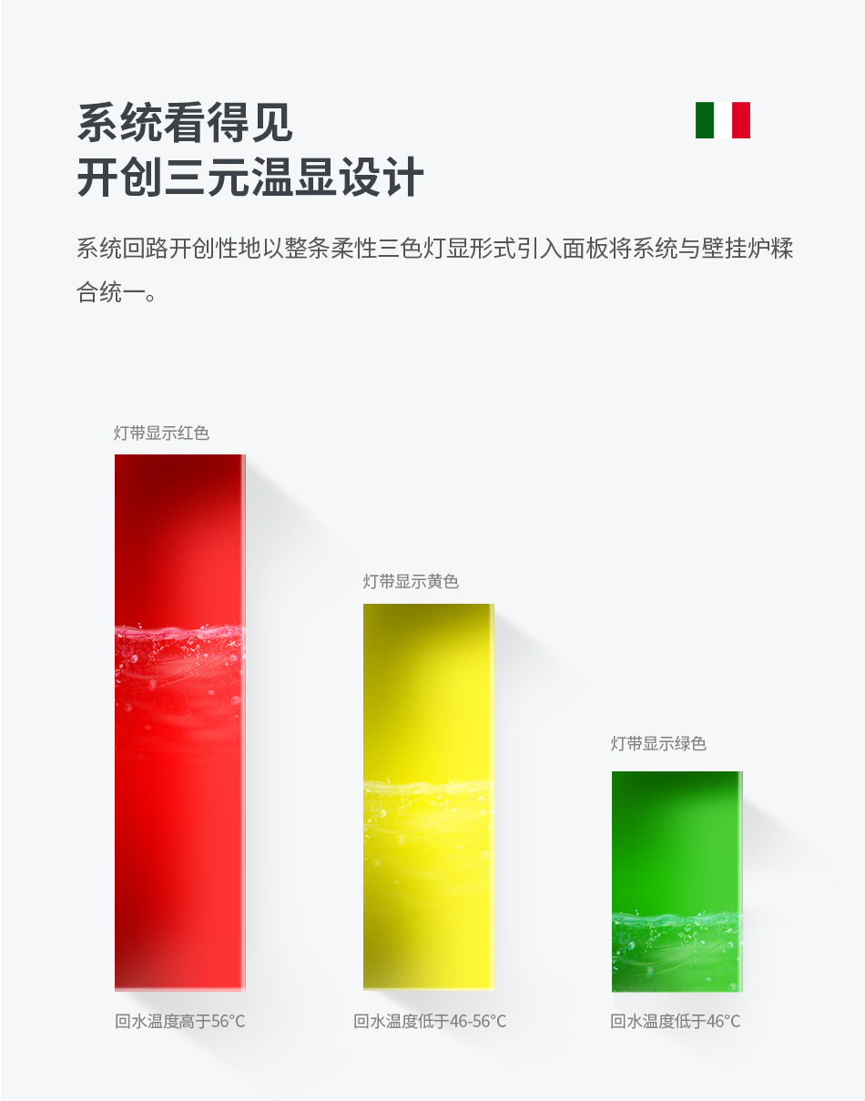 Tubedeluca Hajdu 系列壁挂炉以'关爱,为设计主题,系统回路温度独创地以柔性三色灯显式引入人机界面,将系统与壁挂炉糅合统一,让系统运行状态看得见,便于业主使用与后期维护保养时,十分简便地监测系统运行状态,图本将"关爱理念植入设计、制造、使用、售后全环节。
