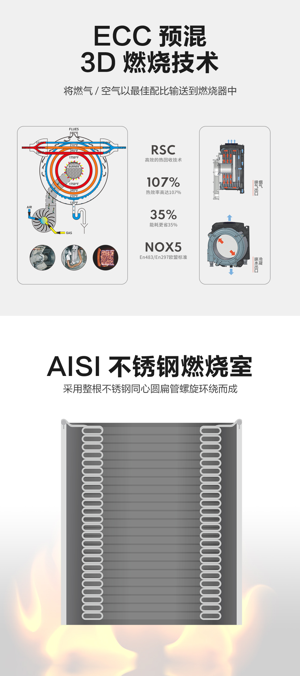 RSC环形换热器(INOX AISI 316)利用流体力学原理的设计结构,实现烟气高效换热以及烟气热量高效回收,构成了图本高热值燃烧技术;充分燃烧的同时,达到超低污染排放;氮化物限排标准达欧盟最高五级。